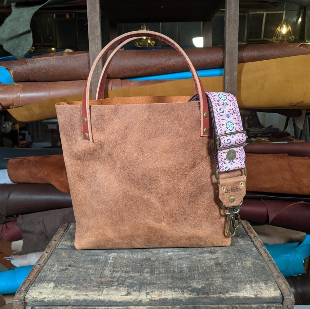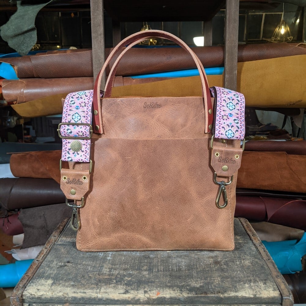 SoRetro FYG Leather Crossbody Tote – Graham Crackers with Eden Gardens on Chocolate Brown