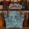 SoRetro Mini+ FYG Leather Crossbody Tote – Castor with Limited Vintage Sliding Daisies Lavender Garden on Violet Cotton Webbing – Bronze Hardware
